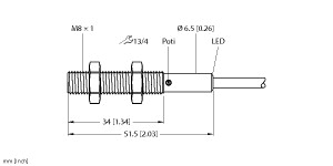 Ø 34mm的光滑圆柱塑料,PBT‐GF30‐V0可通过电位计进行微调3线直流,10…65 VDC常开触点,NPN输出M12 × 1公头连接器