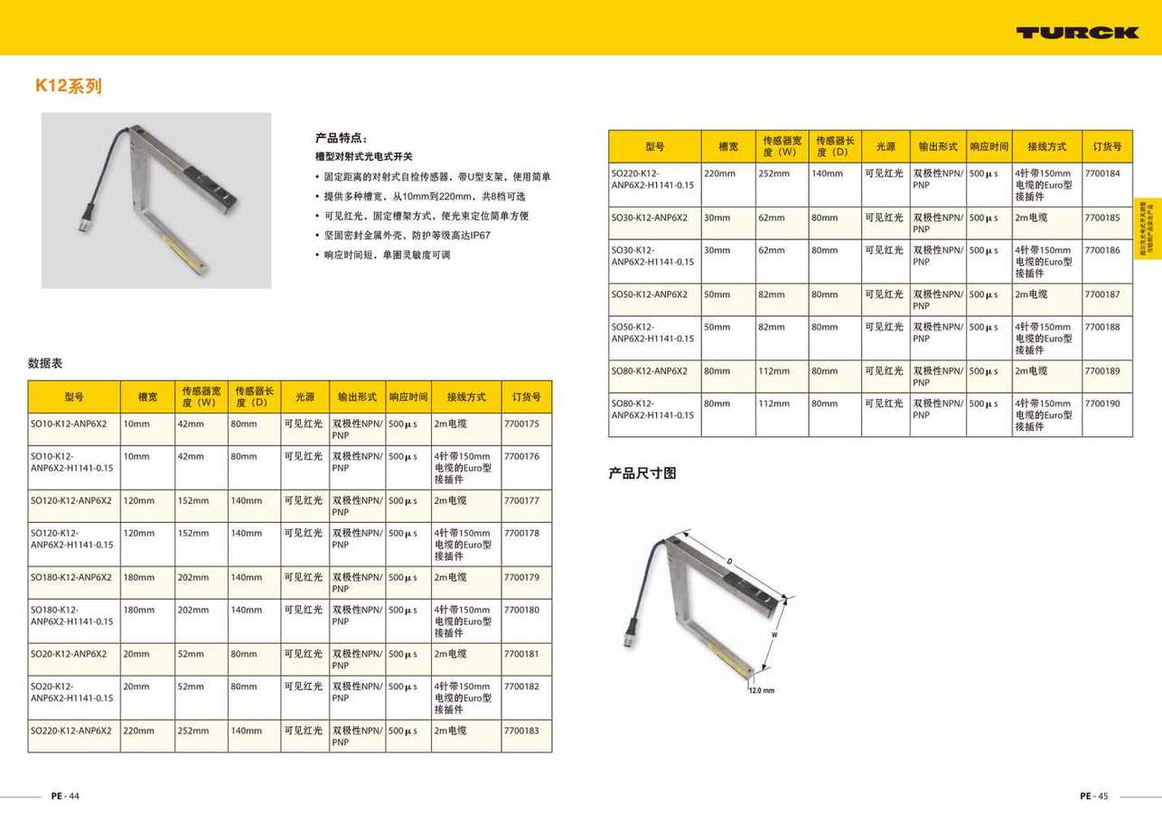 K12系列产品特点:槽型对射式光电式开关• 固定距离的对射式自检传感器,带U型支架,使用简单• 提供多种槽宽,从10mm到220mm,共8档可选• 可见红光,固定槽架方式,使光束定位简单方便• 坚固密封金属外壳,防护等级高达IP67• 响应时间短,单圈灵敏度可调数据表型号槽宽传感器宽度(W)传感器长度(D)光源输出形式 响应时间 接线方式订货号SO10-K12-ANP6X210mm42mm80mm可见红光 双极性NPN/500μs2m电缆7700175PNP型号槽宽传感器宽度(W)传感器长度(D)光源输出形式 响应时间 接线方式订货号SO220-K12-ANP6X2-H1141-0.15220mm252mm140mm可见红光 双极性NPN/500μsPNP77001844针带150mm电缆的Euro型接插件SO30-K12-ANP6X230mm62mm80mm可见红光 双极性NPN/500μs2m电缆7700185PNPSO30-K12-ANP6X2-H1141-0.1530mm62mm80mm可见红光 双极性NPN/500μsPNP77001864针带150mm电缆的Euro型接插件SO50-K12-ANP6X250mm82mm80mm可见红光 双极性NPN/500μs2m电缆7700187PNPSO50-K12-ANP6X2-H1141-0.1550mm82mm80mm可见红光 双极性NPN/500μsPNP77001884针带150mm电缆的Euro型接插件SO80-K12-ANP6X280mm112mm80mm可见红光 双极性NPN/500μs2m电缆7700189PNPSO80-K12-ANP6X2-H1141-0.1580mm112mm80mm可见红光 双极性NPN/500μsPNP77001904针带150mm电缆的Euro型接插件SO10-K12-ANP6X2-H1141-0.1510mm42mm80mm可见红光 双极性NPN/500μsPNP77001764针带150mm电缆的Euro型接插件产品尺寸图SO120-K12-ANP6X2120mm152mm140mm可见红光 双极性NPN/500μs2m电缆7700177PNPSO120-K12-ANP6X2-H1141-0.15120mm152mm140mm可见红光 双极性NPN/500μsPNP77001784针带150mm电缆的Euro型接插件SO180-K12-ANP6X2180mm202mm140mm可见红光 双极性NPN/500μs2m电缆7700179PNPSO180-K12-ANP6X2-H1141-0.15180mm202mm140mm可见红光 双极性NPN/500μsPNP77001804针带150mm电缆的Euro型接插件SO20-K12-ANP6X220mm52mm80mm可见红光 双极性NPN/500μs2m电缆7700181PNPSO20-K12-ANP6X2-H1141-0.1520mm52mm80mm可见红光 双极性NPN/500μsPNP77001824针带150mm电缆的Euro型接插件SO220-K12-ANP6X2220mm252mm140mm可见红光 双极性NPN/500μs2m电缆7700183PNPDW12.0 mmPE - 44PE - 45