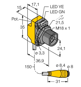 检测距离 : 5 ... 350 mm 调整范围 : 30 ... 350 mm 光源 : LED 光源类型 : 调制可见红光 光点直径 : 大约 20 mm 相距 350 mm 发散角 : 大约 4 ° 光学端面 : 向前直射 环境光限制 : EN 60947-5-2:2007+A1:2012 MTTFd : 860 a 任务时间 (TM) : 20 a 诊断覆盖率 (DC) : 0 % 工作指示灯 : 绿色 LED:通电 功能指示灯 : 黄色 LED 亮起: 传感器 检测背景 控制元件 : 感应范围调节器 控制元件 : 亮时接通/暗时接通转换开关 工作电压 : 10 ... 30 V DC 纹波 : 最大 10 % 空载电流 : < 20 mA 开关类型 : 该传感器的开关类型是可更改的。默认设置为: 亮时接通 信号输出 : 1 路 NPN 输出,短路保护,反极性保护,集电极开路 开关电压 : 最大 30 V DC 开关电流 : 最大 100 mA , 阻抗负载 电压降 : ≤ 1,5 V DC 开关频率 : 500 Hz 响应时间 : 1 ms 产品标准 : EN 60947-5-2 EAC 符合性 : TR CU 020/2011 UL 认证 : cULus 认证的 2 类电源,或具有有限电压输出且带(可以是集成式)保险丝(最大值为 3.3 A,符合 UL248 标准)的认证电源,1 类外壳 CCC 认证 : 额定电压 ≤ 36 V 时,产品不需要 CCC 认证/标记 环境温度 : -30 ... 60 °C (-22 ... 140 °F) 存储温度 : -40 ... 70 °C (-40 ... 158 °F) 外壳宽度 : 11 mm 外壳高度 : 31 mm 外壳深度 : 20 mm 防护等级 : IP67 连接 : 连接器 M8 x 1 , 4 针 材料 : 质量 : 大约 10 g 紧固螺丝的紧固扭矩 : 0,6 Nm