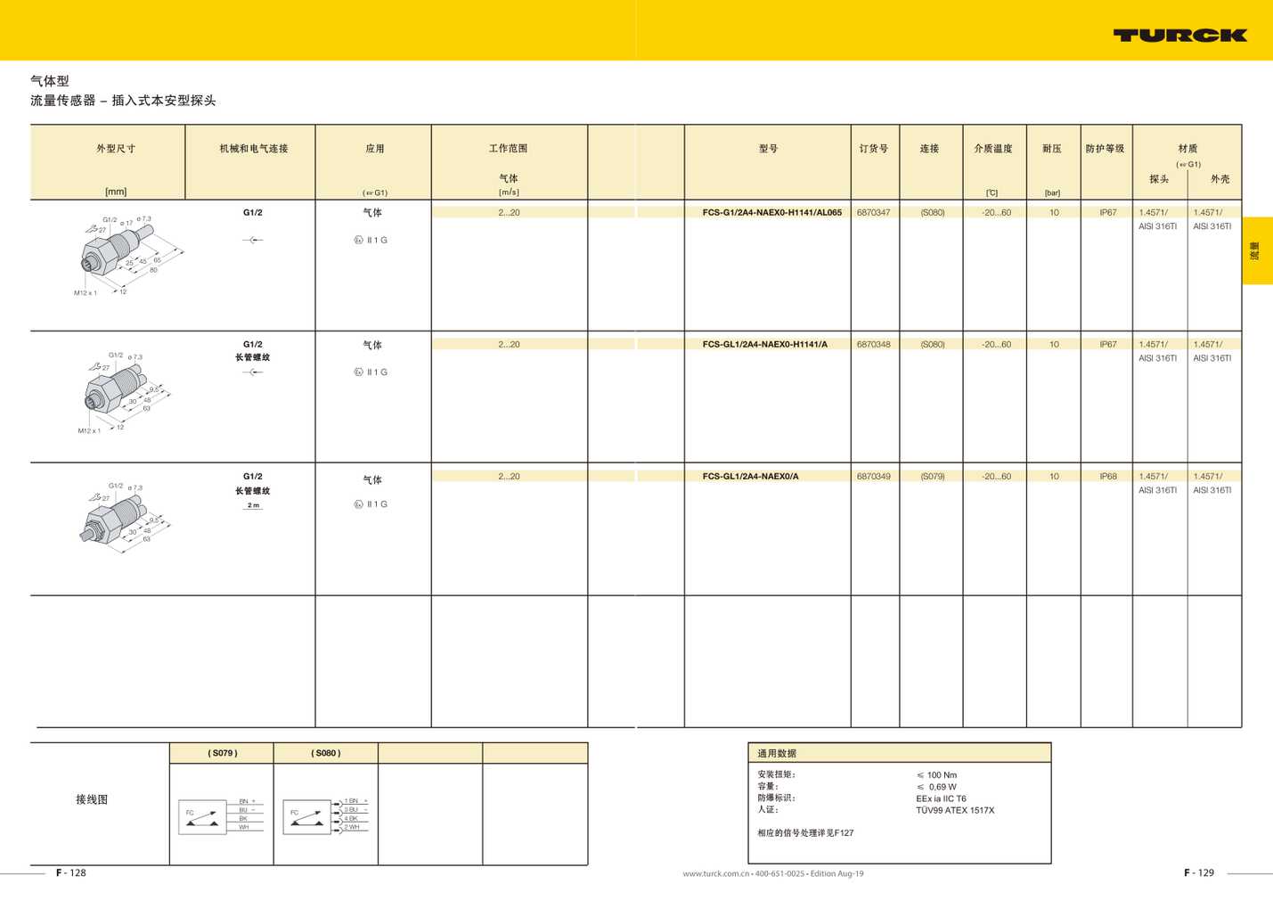 气体型流量传感器 - 插入式本安型探头外型尺寸机械和电气连接应用工作范围型号订货号连接介质温度耐压防护等级[mm]G1/2( G1)气体气体[ m/s ]2...20FCS-G1/2A4-NAEX0-H1141/AL0656870347(S080)-20...60[℃][bar]10材质( G1)探头外壳流量IP671.4571/1.4571/AISI 316TIAISI 316TIG1/2长管螺纹气体2...20FCS-GL1/2A4-NAEX0-H1141/A6870348(S080)-20...6010IP671.4571/1.4571/AISI 316TIAISI 316TIG1/2长管螺纹气体2...20FCS-GL1/2A4-NAEX0/A6870349(S079)-20...6010IP681.4571/1.4571/AISI 316TIAISI 316TI( S079 )( S080 )FC+–1 BN3 BU4 BK2 WH接线图F - 128F124通用数据安装扭矩:容量:防爆标识:人证:相应的信号处理详见F127≤ 100 Nm≤ 0,69 WEEx ia IIC T6TÜV99 ATEX 1517XF - 129F125