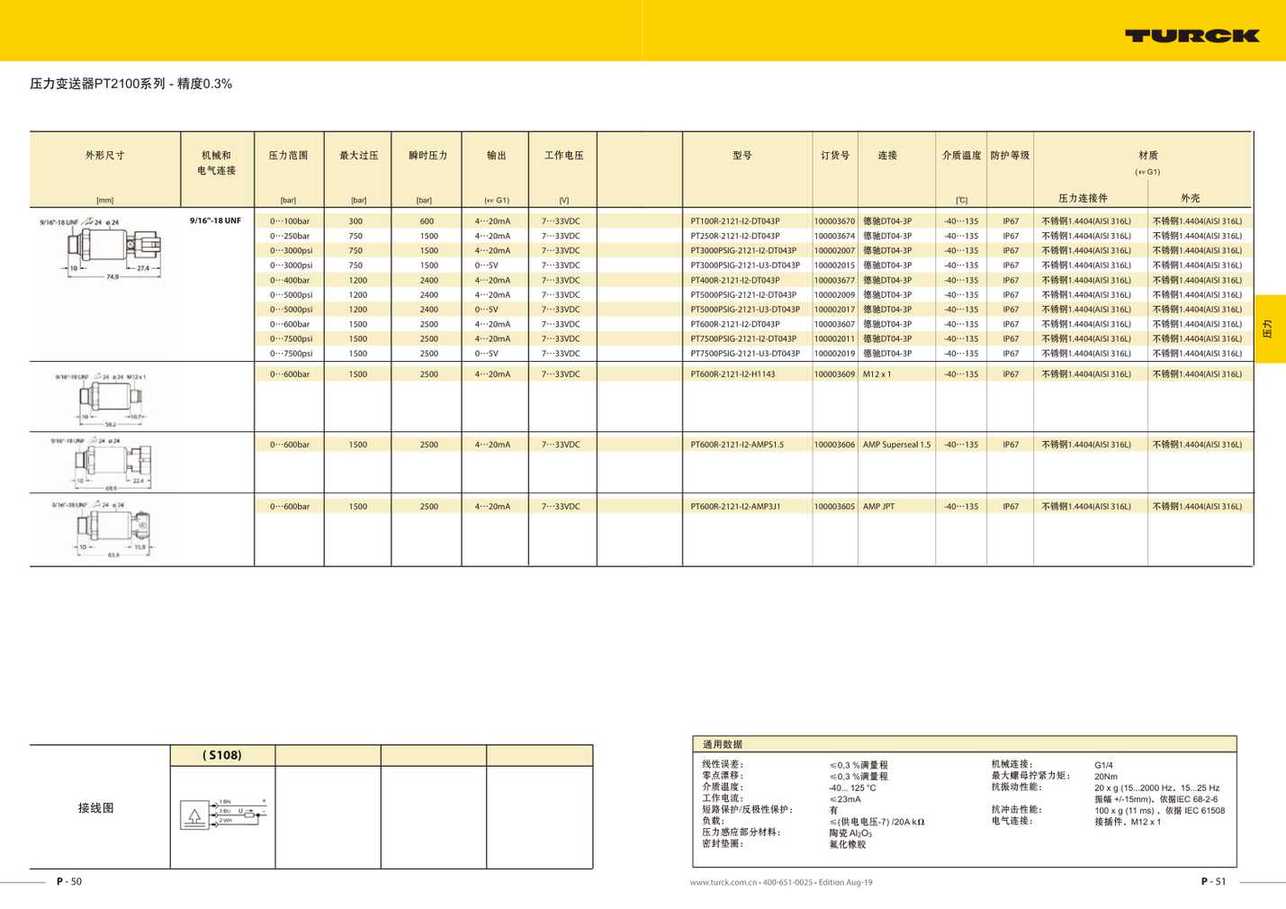 压力变送器PT2100系列 - 精度0.3%外形尺寸[mm]机械和电气连接9/16''-18 UNFG 1/4内螺纹压力范围最大过压瞬时压力输出工作电压型号订货号连接介质温度 防护等级材质( G1)[bar]0…100bar0…250bar0…3000psi0…3000psi0…400bar0…5000psi0…5000psi0…600bar0…7500psi0…7500psi0…600bar[bar]3007507507501200120012001500150015001500[bar]( G1)[V]60015001500150024002400240025002500250025004…20mA4…20mA4…20mA0…5V4…20mA4…20mA0…5V4…20mA4…20mA0…5V7…33VDC7…33VDC7…33VDC7…33VDC7…33VDC7…33VDC7…33VDC7…33VDC7…33VDC7…33VDCPT100R-2121-I2-DT043P100003670 德驰DT04-3PPT250R-2121-I2-DT043P100003674 德驰DT04-3PPT3000PSIG-2121-I2-DT043P100002007 德驰DT04-3PPT3000PSIG-2121-U3-DT043P100002015 德驰DT04-3PPT400R-2121-I2-DT043P100003677 德驰DT04-3PPT5000PSIG-2121-I2-DT043P100002009 德驰DT04-3PPT5000PSIG-2121-U3-DT043P100002017 德驰DT04-3PPT600R-2121-I2-DT043P100003607 德驰DT04-3PPT7500PSIG-2121-I2-DT043P100002011 德驰DT04-3PPT7500PSIG-2121-U3-DT043P100002019 德驰DT04-3P4…20mA7…33VDCPT600R-2121-I2-H1143100003609 M12 x 1[℃]-40…135-40…135-40…135-40…135-40…135-40…135-40…135-40…135-40…135-40…135-40…135压力连接件外壳不锈钢1.4404(AISI 316L)不锈钢1.4404(AISI 316L)不锈钢1.4404(AISI 316L)不锈钢1.4404(AISI 316L)不锈钢1.4404(AISI 316L)不锈钢1.4404(AISI 316L)不锈钢1.4404(AISI 316L)不锈钢1.4404(AISI 316L)不锈钢1.4404(AISI 316L)不锈钢1.4404(AISI 316L)不锈钢1.4404(AISI 316L)不锈钢1.4404(AISI 316L)不锈钢1.4404(AISI 316L)不锈钢1.4404(AISI 316L)不锈钢1.4404(AISI 316L)不锈钢1.4404(AISI 316L)不锈钢1.4404(AISI 316L)不锈钢1.4404(AISI 316L)不锈钢1.4404(AISI 316L)不锈钢1.4404(AISI 316L)不锈钢1.4404(AISI 316L)不锈钢1.4404(AISI 316L)IP67IP67IP67IP67IP67IP67IP67IP67IP67IP67IP67压力0…600bar150025004…20mA7…33VDCPT600R-2121-I2-AMPS1.5100003606 AMP Superseal 1.5-40…135IP67不锈钢1.4404(AISI 316L)不锈钢1.4404(AISI 316L)0…600bar150025004…20mA7…33VDCPT600R-2121-I2-AMP3J1100003605 AMP JPT-40…135IP67不锈钢1.4404(AISI 316L)不锈钢1.4404(AISI 316L)( S108)接线图P - 50P36通用数据线性误差:零点漂移:介质温度:工作电流:短路保护/反极性保护:负载:压力感应部分材料:密封垫圈:≤0,3 %满量程≤0,3 %满量程-40... 125 °C≤23mA有≤(供电电压-7) /20A kΩ陶瓷 Al2O3氟化橡胶机械连接:最大螺母拧紧力矩:抗振动性能:抗冲击性能:电气连接:G1/420Nm20 x g (15...2000 Hz,15...25 Hz 振幅 +/-15mm),依据IEC 68-2-6 100 x g (11 ms) ,依据 IEC 61508接插件,M12 x 1P - 51P37